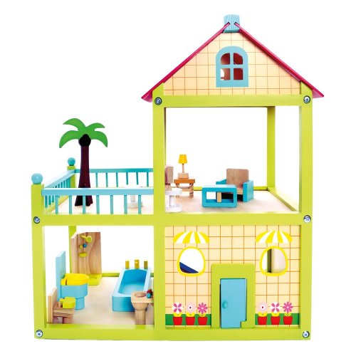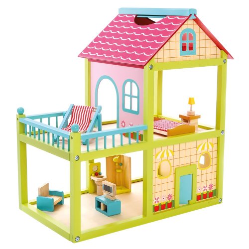 Veľký drevený domček pre bábiky v pestrých farbách je krásna hračka, ktorá vzbudí zvedavosť každého dieťaťa a udrží jeho pozornosť po dlhú dobu! Domček pre bábiky má terasu a je vybavený nábytkom. Hlavné vlastnosti: Podporuje herné nápady domček je celý otvorený pre lepšie hranie rozmery: 50 cm dĺžka x šírka 32 x výška 55,5 cm