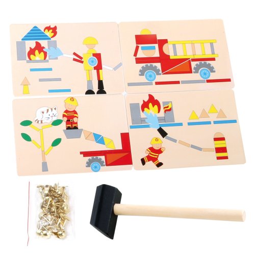 Obľúbená hra s kladivkom skvele podporuje tvorivosť a predstavivosť detí. Z rozmanitých rôznofarebných dielikov je možné vytvoriť mnoho motívov as pomocou klinčekov a kladivka ich pripevniť do korkovej podložky a opätovne rozobrať. Rozvíja jemnú motoriku, trpezlivosť aj koordináciu očí a rúk dieťaťa. Hlavné vlastnosti: podložka, kladivko, 78 drevených a 8 papierových dielikov, 80 klinčekov
