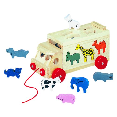 Nákladiak plný pestrofarebných figúrok exotických i domácich zvieratiek môže dieťa sprevádzať na jeho cestách, vďaka praktickej šnúre slúži aj ako ťahacia hračka. Rozvíjajte jemnú motoriku, vkladajte a rozpoznávajte tvary, farby a druhy zvierat. Učte dieťa opatrne chodiť, aby zvieratká nevysypalo. Hračka je robustná, vyrobená z masívneho dreva. Hlavné vlastnosti: nákladiak a 10 dielov na vkladanie2 v 1, vkladačka a ťahacia hračkarozvíja motoriku, rozpoznávanie farieb a tvarovrobustné drevené prevedenie