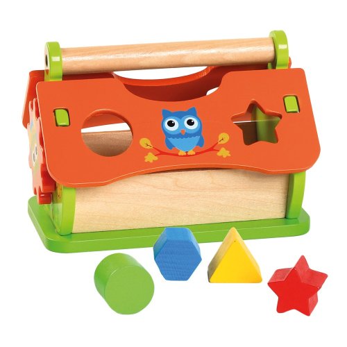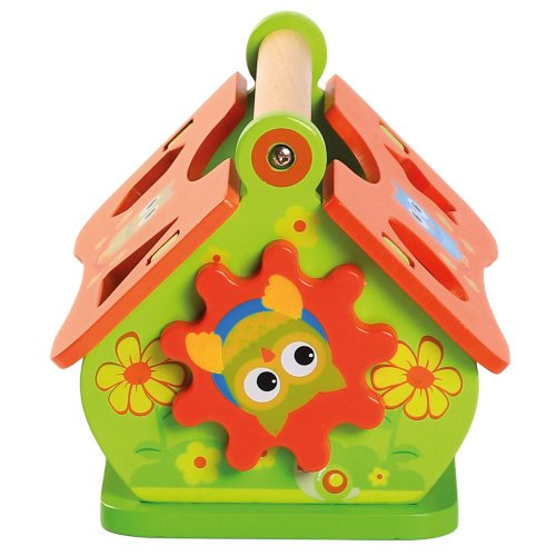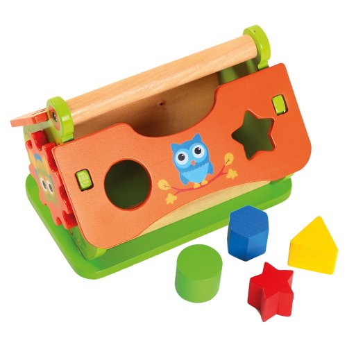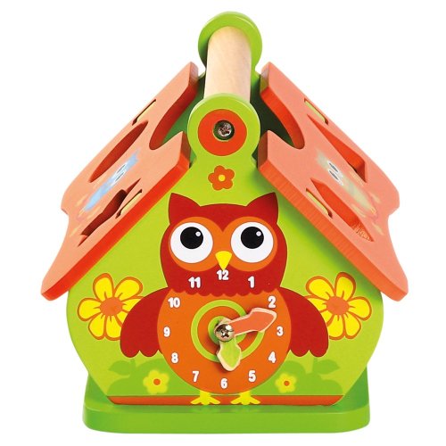 Pestrofarebný domček s odklápacou strechou ponúka dodatočné aktivity na priečeliach. Nechajte dieťa rozvíjať jemnú motoriku vkladaním rôznofarebných kociek a otáčaním ozubeného kolieska. Otáčať možno aj ručičkami hodín s motívom sovy, pri ktorom môžete dieťatko uviesť do orientácie v čase. Domček je univerzálnou hračkou, nájde uplatnenie pri mnohých ďalších hrách. Je robustný, vyrobený zo silnej preglejky a masívneho dreva, vybavený madlom, vďaka ktorému sa bude dieťaťu ľahko prenášať . Hlavné vlastnosti: domček s 2 dielnou strechou a 4 dielmi na vkladanie rozvíja jemnú motoriku, rozpoznávanie farieb a tvarov pomôže uviesť do orientácie v čase robustné drevené prevedenie madlo na prenášanie