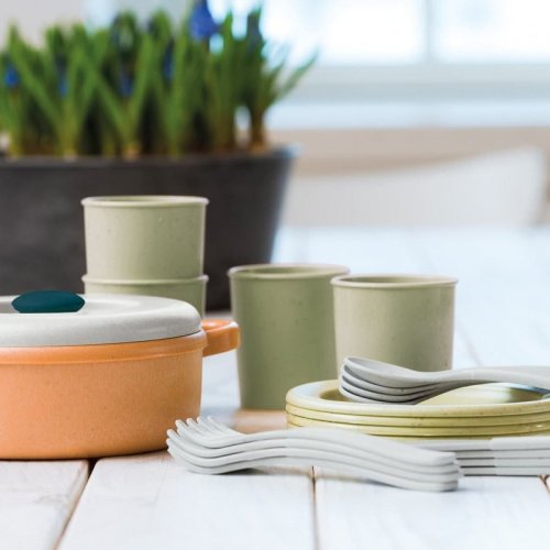 Jedálenská sada v krásnych trendy farbách, vyrobená z bioplastu.