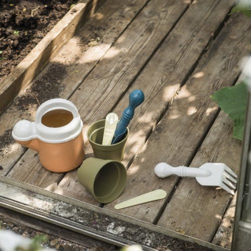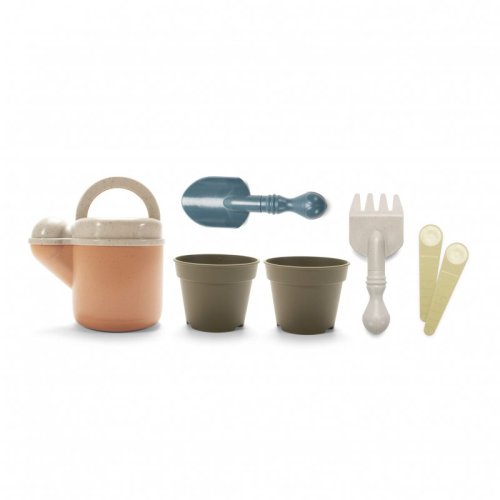 • súprava sa skladá zo 7 dielov - lopatka + hrabličky + kanvička + 2 kvetináče + 2 sádzacie kolíky
