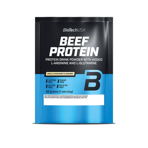Beef Protein od BioTech je hovädzí proteín bez cukru, laktózy a lepku. Základ proteínu tvorí hydrolyzovaná peptidová forma hovädzích bielkovín, ktorá je obohatená o L-glutamín a L-arginín. Hovädzí proteín je zdrojom kvalitných bielkovín, ktoré sú ľahšie stráviteľné ako nízkotučné hovädzie mäso (napr. steak), má skvelú vstrebateľnosť a ako všetky živočíšne bielkoviny aj vynikajúcu biologickú hodnotu. Beef Protein je bez pridaného kreatínu a hoci má nízky obsah tuku, obsahuje kokosový tuk, ktorý je vynikajúcim zdrojom MCT (triglyceridy so stredným reťazcom).