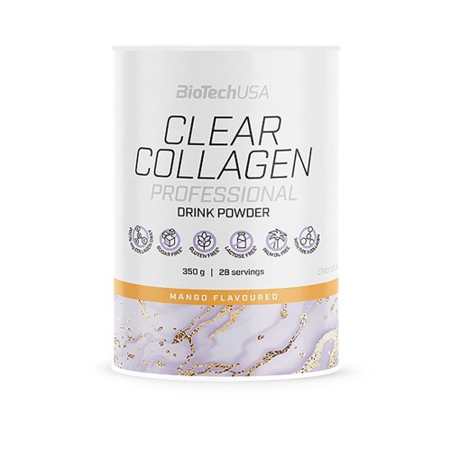 Osviežujúci ochutený nápoj v prášku obsahujúci hydrolyzovaný kolagén, kyselinu hyalurónovú, aminokyseliny, vitamíny, minerály, cukor a sladidlo. vysoko rozpustný a chutný viac ako 20 g kolagénu na dennú dávku (2 x 12,5 g produktu) 105 mg kyseliny hyalurónovej ChondrActiv® hydrolyzovaný prášok na podporu tvorby chrupaviek obohatený o kolagén typu II s vitamínmi a minerálmi s aminokyselinami a antioxidantmi palmového oleja Bez laktózy: menej ako 0,1 g laktózy na 100 ml hotového výrobku pripraveného na pitie. Bez lepku: podľa nariadenia EÚ Bez cukru: menej ako 0,5 g cukru na 100 ml hotového výrobku pripraveného na pitie. Bez tuku: menej ako 0,5 g tuku na 100 ml hotového výrobku pripraveného na pitie. Podobne ako Clear Collagen obsahuje produkt Clear Collagen Professional hydrolyzovaný kolagén s pridaným vitamínom C, ktorý prispieva k normálnej tvorbe kolagénu, k udržaniu normálnej pokožky, normálnej funkcii krvných ciev, chrupaviek, zubov a ďasien. Clear Collagen Professional tiež obsahuje ChondrActiv® hydrolyzovaný prášok na podroru tvorby chrupaviek. Výrobok je obohatený o vitamíny a minerály, ktoré prispievajú k udržaniu normálneho stavu pokožky, vlasov, nechtov a chrupaviek. Niektoré z pridaných stopových prvkov (zinok, vitamín C, vitamín E, selén, meď a riboflavín) majú antioxidačné vlastnosti, ktoré prispievajú k ochrane buniek pred oxidačným stresom.