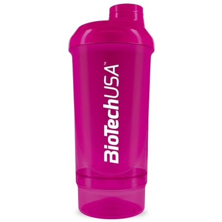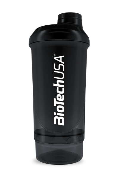 Šejker Biotech 500 ml so zásobníkom s objemom 150 ml. Pridané sitko pre ľahšie rozmiešanie obsahu bez hrudiek. Skrutkovacie malé viečko aj veľký uzáver skvele zabraňujú úniku vody.
