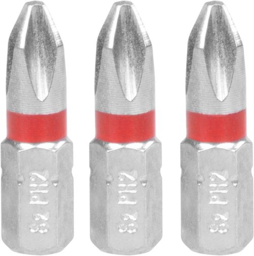 Kvalitné hroty PH2 dĺžky 25 mm vyrobené z ocele S2. Cena za súpravu 3 ks. Bity sú farebne odlíšené podľa typu hrotu (PH červená). EAN 8585023321032