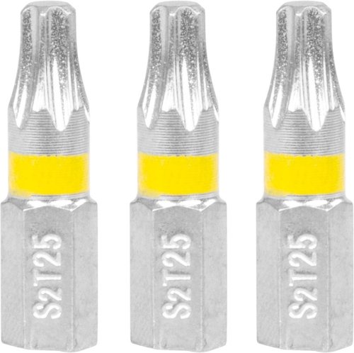 Kvalitné hroty TORX 25 dĺžky 25 mm vyrobené z ocele S2. Súprava 3 ks. Bity sú farebne odlíšené podľa typu hrotu (TORX žltá). EAN 8585023321124