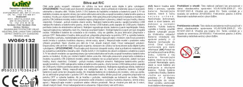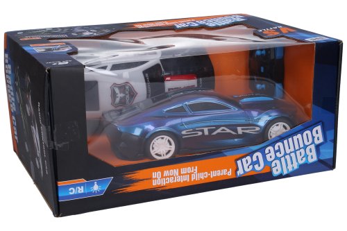 Bitka áut RC na diaľkové ovládanie. Súčasťou 2 autá. Veľkosť 25 cm. Frekvencia 2.4GHz. Svetelné efekty. Batériový pack 3.7V do každého auta súčasťou, 2xAA do každého ovládača nie sú súčasťou. USB kábel súčasťou. ON/OFF tlačidlo na ovládači. Nárazom do výfuku na ľavej strane auta dôjde k jeho vykoľajeniu.