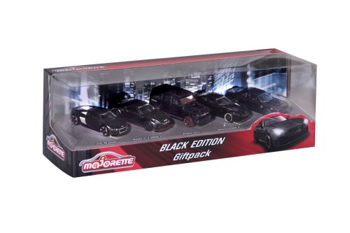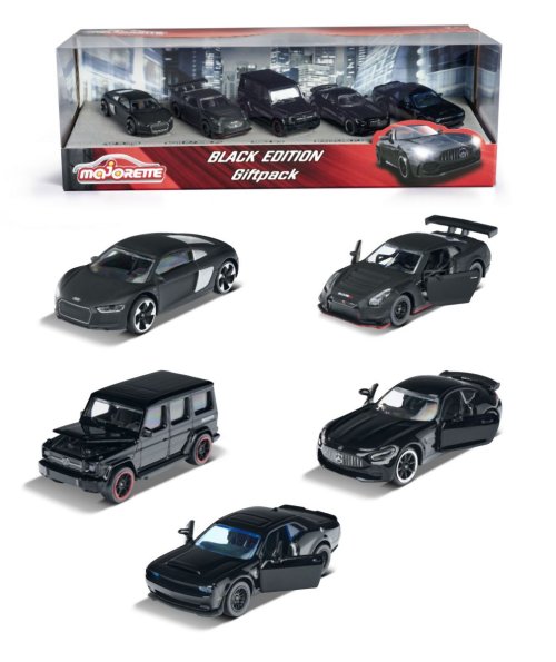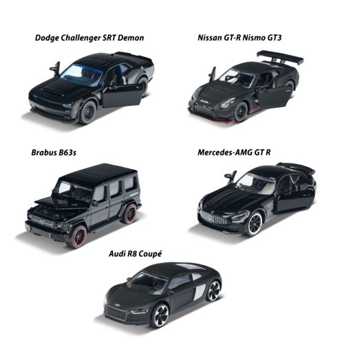 Kovová autíčka na voľnobeh, s odpružením a otváracími časťami, súprava 5 ks v darčekovom balení. Black edition s modelmi: Audi R8, Brabus B63, Nissan GT3 Nismo GTR, Dodge Demon a Mercedes-AMG GTR. S vysoko kvalitným lakom a ráfiky, v mierke 1:64.