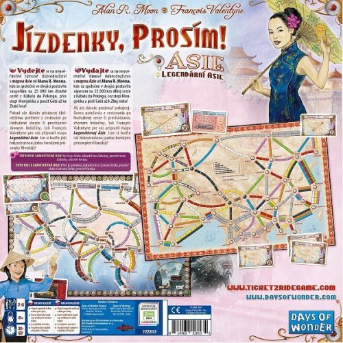 Rozšírenie úspešnej cestovateľskej hry Cestovné lístky, prosím! s dvoma rôznymi mapami a klasickou aj tímovou hrou. Vydajte sa na neuveriteľné tímové dobrodružstvo s mapou Ázie, kde sa spoločne vo dvojici postavíte súperom na 25 000 km dlhej ceste z Kábulu do Pekingu, cez stepi Mongolska a púšť Gobi až k Žltej rieke! Mapa Ázie je navrhnutá špeciálne pre tímovú hru so 4 alebo 6 hráčmi. Pokiaľ ale dávate prednosť pokojnejšiemu potešeniu z cestovania po Hodvábnom chodníku či prechádzaní zhonom Indočíny, tak je pre Vás pripravená mapa Legendárnej Ázie, ktorá je obrazom ďalekých východných krajín na úsvite 20. storočia. Len si buďte istí hrôzostrašnou jazdou horskými priesmykmi Himaláje! Toto nie je samostatná hra! K hre je potrebné základná hra Cestovné lístky, prosím! alebo Cestovné lístky, prosím! Európa. Obsah balenia: