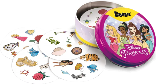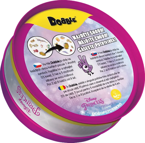 Obľúbená postrehová hra Dobble na motívy Disney princezien, postavičiek a charakterov. Rýchlosť, postreh, reflexy! Dobble Disney princeznej, to je 57 rôznych symbolov, 55 kariet, 8 obrázkov na karte a každé dve karty spolu majú spoločný len jeden obrázok! Hra je kompletne v češtine aj slovenčine a ponúka úplne unikátnu zábavu. Deti tu hľadajú dva rovnaké obrázky na kartách pri rôznych verziách hry (v pravidlách je popísané celkom 5 hier). Super sú okrúhle karty aj jednoduché pravidlá vysvetlené doslova za pár sekúnd. Hra je určená predovšetkým pre deti, ale aj ich rodičov – skrátka pre všetkých, ktorí sa chcú poriadne baviť a nemajú čas prečítať dlhé pravidlá. Plechová krabička zaručuje bezpečie kariet a jednoducho umožňuje mať hru vždy pri sebe. Vyskúšajte aj Vy postrehový fenomén Dobble a určite budete prekvapení, ako aj tak jednoduchá hra môže byť zábavná! V pravidlách nájdete popísaných všetkých 57 rôznych symbolov. Obsah balenia: 55 kariet v plechovej krabičke 1 české, slovenské a rumunské pravidlá