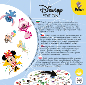 Objavte symboly s vašimi obľúbenými postavičkami od Disneyho a Pixaru v tejto špeciálnej edícii klasickej hry Dobble: hry na postreh a rýchle reflexy, ktorá je vhodná pre každého. Buďte prvý, kto nájde zhodný symbol na dvoch kartách, a vyhrajte. Hra obsahuje 90 veľkých kariet (väčších ako pri klasickej hre Dobble) a 5 minihier. Na každej z 90 kartičiek sa nachádza 10 symbolov. Celkom je v hre 91 jedinečných symbolov. Na dvoch ľubovoľných kartách je vždy iba jeden symbol rovnaký. Oproti zvyklostiam nie je tento Dobble balený v plechovej krabičke.