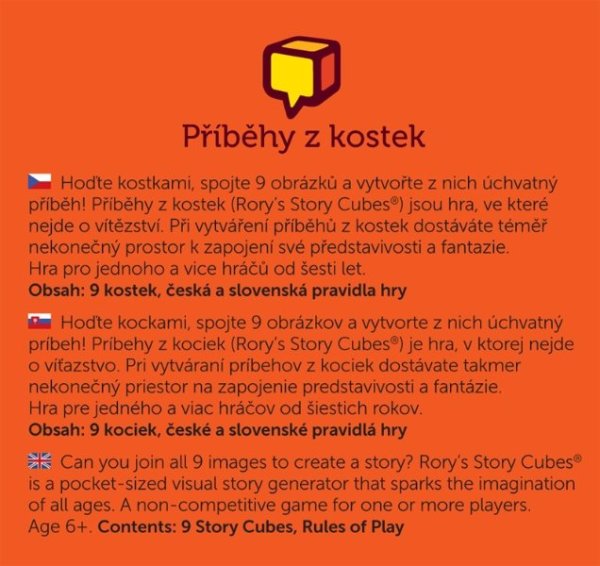 Jedinečná hra, ktorá rozvíja predstavivosť a kreativitu detí i dospelých pre jedného a viacerých hráčov od šiestich rokov. 9 kociek, 54 obrázkov, 10 miliónov kombinácií, nekonečné rozprávky... Hoďte kockami, spojte 9 obrázkov a vytvorte z nich úchvatný príbeh! Príbehy z kociek (Rory´s Story Cubes) sú hra, v ktorej nejde o víťazstvo. Pri vytváraní príbehov z kociek dostávate takmer nekonečný priestor na zapojenie svojej predstavivosti a fantázie. Princíp hry: Hoďte kockami a pozrite sa na obrázky, ktoré Vám padli. Začnite skladať príbeh, v ktorom sa všetko, čo je na kockách, objaví. Príliš nepremýšľajte, začnite niektorým z obrázkov a príbeh sa začne rozvíjať sám. Buď len tak rozprávajte alebo súťažte o najzaujímavejší príbeh. Balené v praktickej a zároveň atraktívnej krabičke z pevného kartónu, s magnetickým uzáverom. Hra obsahuje: 9 kociek s obrázkami, české a slovenské pravidlá