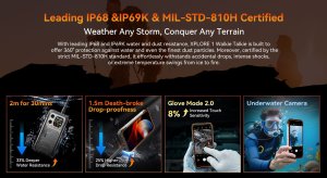Odolnosť: IP68, IP69K, MIL-STD-810H (voda, prach, mráz, pád z 1,5 m)