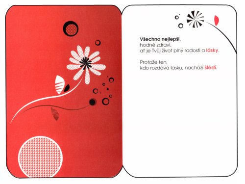 Papierové blahoželanie k narodeninám červenej farby s kvetinovým motívom a textom.