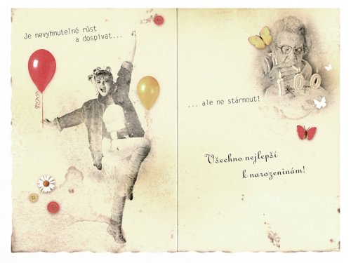 Papierové blahoželanie k narodeninám s textom a motívmi v retro štýle.