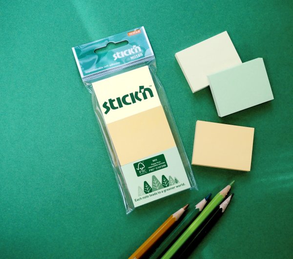 Samolepiace bločky v mixe pastelových farieb vyrobené z papiera, ktorý pochádza z ekologicky obhospodarovaných lesov
