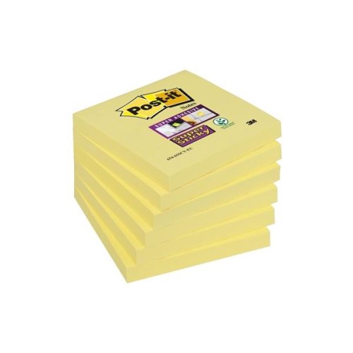 Silne lepiace bločky Post-it Super Sticky v tradičnej žltej farbe Spĺňajú certifikáciu PEFC Bločky balené jednotlivo Vhodné na lepenie vo vertikálnej polohe, napr. na monitor 90 lístkov v bločku