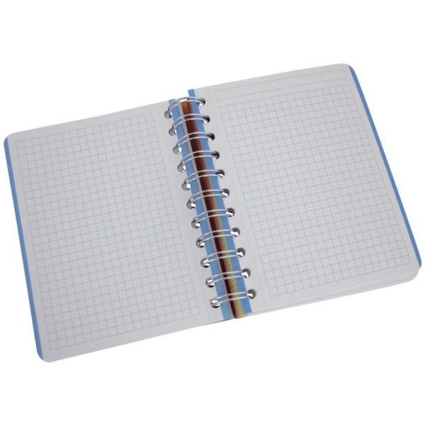 Kancelársky blok s farebnou ryhovanou obálkou z polypropylénu Biely bezdrevý papier 80 g Zaoblené rohy Listy majú mikroperforáciu pre ľahké odtrhnutie a 4otvorové dierovanie Kovová špirála Štvorček 5 mm
