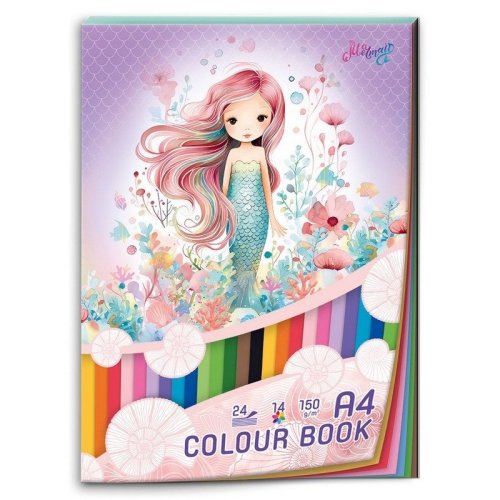 Blok farebného papiera veľkosti A4 MERMAID. br• blok obsahuje 24 farebných listov v 14 farbách br• list farebného papiera váži 150g br• vhodné sú na výtvarnú výchovu a kreatívne tvorenie zvlášť pre pevnejšiu gramáž papiera