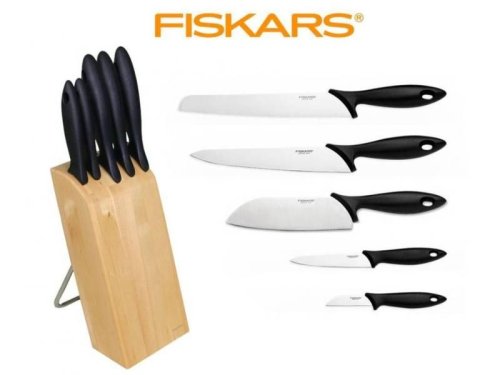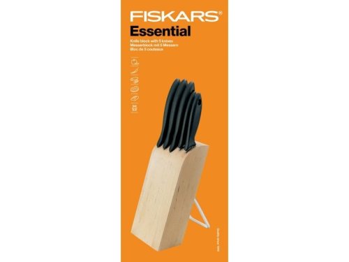Blok z brezového dreva s piatimi základnými kuchynskými nožmi - lúpací, okrajovací nôž, nôž na pečivo, kuchynský a ázijský kuchársky nôž. Výška: 372 mm, dĺžka: 126 mm, šírka: 79 mm, hmotnosť: 1460 g. Pôvodné Fiskars číslo: 1004931.