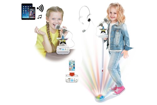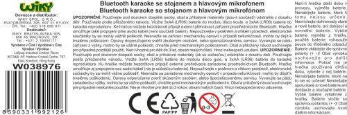 Bluetooth karaoke s hlavovým mikrofónom. Obsah - karaoke modul, stojan s mikrofónom, hlavový mikrofón. Ovládací panel so stojanom na mobil/prehrávač. Nastaviteľná výška stojana 65-100 cm. Vstup na mobil, MP3 prehrávač. Funkcia - zmena hlasu (mužský, ženský), 2 mikrofóny súčasne, ozvena, nastavenie hlasitosti, disco guľa na stojane so svetelnými efektmi. Karaoke reproduktor - 3xAA batérie, disco guľa - 3xAA nie sú súčasťou.