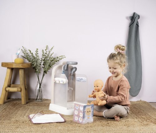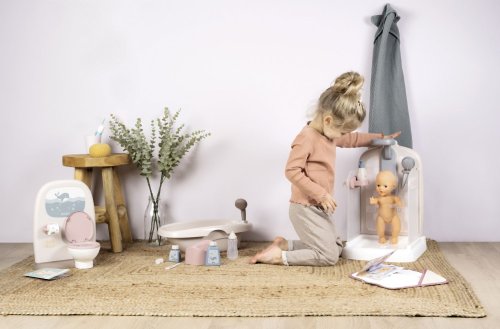 Sprchovací kút pre bábiky Baby Nurse s funkčnou sprchovou hlavicou, funkcia prúdu vody vďaka čerpadlu a nádrži na vodu. Sprcha má držiak na uterák, háčiky na župany, poličku, pevnú sprchu, hlavicu a rad ďalšieho príslušenstva. Vhodné pre bábiky do 40 cm (bábika nie je súčasťou balenia). Rozmery produktu (DxŠxV): 30,9 x 29,9 x 46,6 cm. Hmotnosť 1,845 kg.