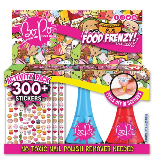 Revolúcia vo svete manikúry. Už žiadny odlakovač! Naneste lak, nechajte ho zaschnúť a užívajte si krásne nechty. Chcete zmeniť štýl? Chcete si užiť ďalšie žiarivú farbu? Jednoducho lak zo svojho nechtu zlúpnite a hneď môžete lakovať znova. Pozor. NOVINKA! Teraz si užite Bo-Po laky s úžasnými vôňami. Tieto laky sú zdravotne nezávadné, šetrné k detským nehtíkům a neobsahujú acetylén. Fľaštička je navrhnutá tak, že sa nevyleje. Pre deti od 3 rokov.