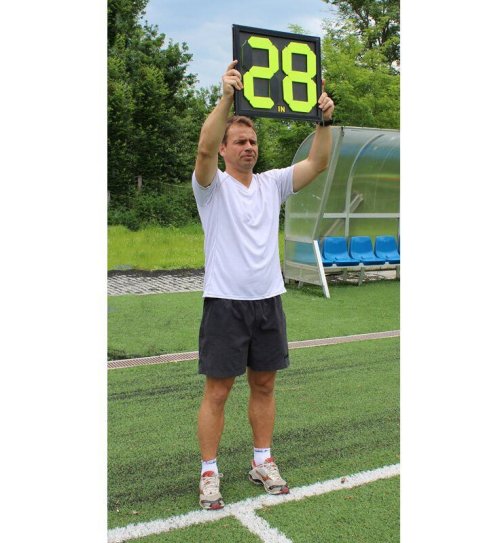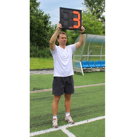 Mechanická tabuľa pre striedanie Merco Board je veľmi obľúbená medzi trénermi. Číslice sú natreté reflexnými farbami. Z jednej strany sú natreté na žlto, druhá strana na oranžovo, takže sú skvele vidieť aj z veľkej diaľky. Vďaka novému rotačnému systému, ktorý si značka Merco nechala patentovať, nastavíte mechanicky číslice za veľmi krátku dobu. 43,5 x 37,5 x 2 cm