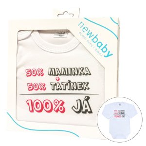 Originálne bavlnené dojčenské body s dlhým rukávom New Baby, s vtipným nápisom 50% MAMIČKA + 50% Otecko - 100% JA. Body má okolo krčku, nožičiek a ručičiek farebné lemovanie. Farby použité na potlač sú certifikované a vhodné pre bábätká. Je vyrobené z príjemného a kvalitného materiálu, v ktorom sa bude Vaše bábätko cítiť príjemne. Body má zapínanie na cvočky na ramienku a medzi nožičkami, čo uľahčuje obliekanie a prebaľovanie. Doprajte Vášmu bábätku vyniknúť v originálnom bode. Zloženie: 100% bavlna. Rozmery: obvod okolo hrudníka cca 36 cm, dĺžka rukáva cca 18 cm, celková dĺžka cca 32 cm.<BR>- Produkt českej značky