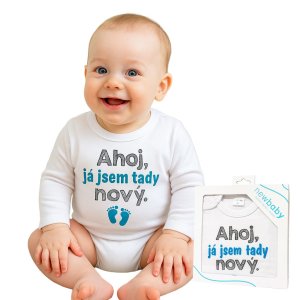 Originálne bavlnené dojčenské body s dlhým rukávom New Baby, s vtipným nápisom Ahoj, ja som tu nový. Farby použité na potlač sú certifikované a vhodné pre bábätká. Je vyrobené z príjemného a kvalitného materiálu, v ktorom sa bude Vaše bábätko cítiť príjemne. Body má zapínanie na cvočky na ramienku a medzi nožičkami, čo uľahčuje obliekanie a prebaľovanie. Doprajte Vášmu bábätku vyniknúť v originálnom bode. Zloženie: 100% bavlna. Rozmery: obvod okolo hrudníka cca 34 cm, dĺžka rukáva cca 16 cm, celková dĺžka cca 30 cm.<BR>- Produkt českej značky