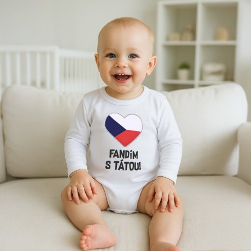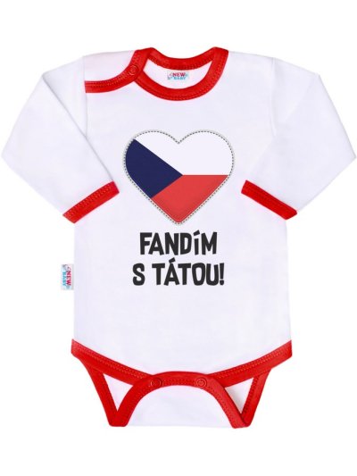 Originálne bavlnené dojčenské body s dlhým rukávom New Baby, s vtipným nápisom Fandím s otcom a obrázkom českej vlajky. Body má okolo krčku, nožičiek a ručičiek farebné lemovanie. Farby použité na potlač sú certifikované a vhodné pre bábätká. Je vyrobené z príjemného a kvalitného materiálu, v ktorom sa bude Vaše bábätko cítiť príjemne. Body má zapínanie na cvočky na ramienku a medzi nožičkami, čo uľahčuje obliekanie a prebaľovanie. Doprajte Vášmu bábätku vyniknúť v originálnom bode. Zloženie: 100% bavlna. Rozmery: obvod okolo hrudníka cca 36 cm, dĺžka rukáva cca 18 cm, celková dĺžka cca 32 cm.<BR>- Produkt českej značky