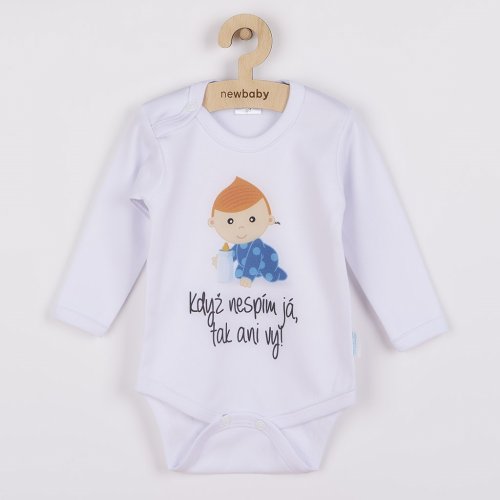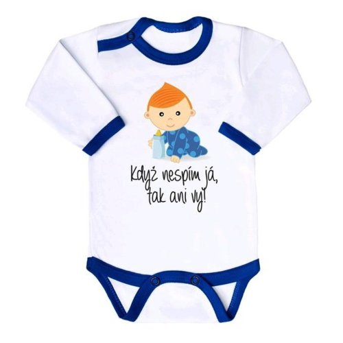 Originálne bavlnené dojčenské body s dlhým rukávom New Baby, s vtipným nápisom Keď nespím ja, tak ani vy! A obrázkom roztomilého chlapčeka. Body má okolo krčku, nožičiek a ručičiek farebné lemovanie. Farby použité na potlač sú certifikované a vhodné pre bábätká. Je vyrobené z príjemného a kvalitného materiálu, v ktorom sa bude Vaše bábätko cítiť príjemne. Body má zapínanie na cvočky na ramienku a medzi nožičkami, čo uľahčuje obliekanie a prebaľovanie. Doprajte Vášmu bábätku vyniknúť v originálnom bode. Zloženie: 100% bavlna. Rozmery: obvod okolo hrudníka cca 36 cm, dĺžka rukáva cca 18 cm, celková dĺžka cca 32 cm.<BR>- Produkt českej značky