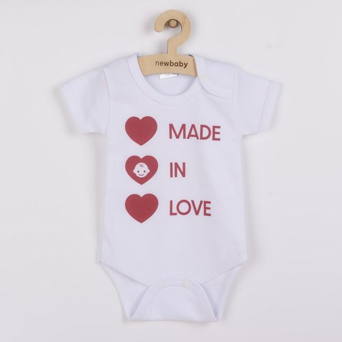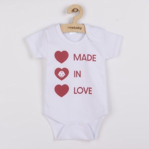 Originálne bavlnené dojčenské body s krátkym rukávom New Baby s nápisom MADE IN LOVE a obrázkom. Farby použité na potlač sú certifikované a vhodné pre bábätká. Je vyrobené z príjemného a kvalitného materiálu, v ktorom sa bude Vaše bábätko cítiť príjemne. Body má zapínanie na cvočky na ramienku a medzi nožičkami, čo uľahčuje obliekanie a prebaľovanie. Doprajte Vášmu bábätku vyniknúť v originálnom bode. Zloženie: 100% bavlna.<BR>- Produkt českej značky