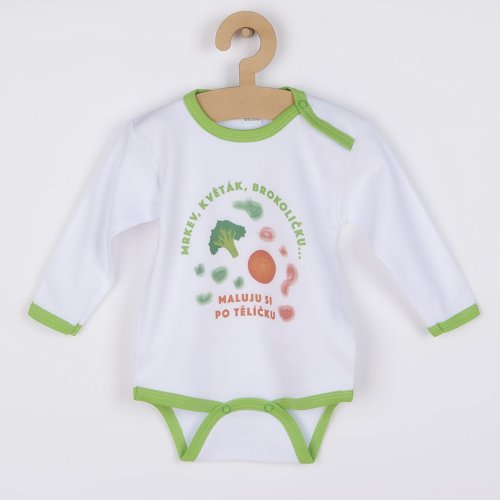 Originálne bavlnené dojčenské body s dlhým rukávom New Baby, s vtipným nápisom Mrkva, karfiol, brokoličku... maľujem si po telíčku. Body má okolo krčku, nožičiek a ručičiek farebné lemovanie. Farby použité na potlač sú certifikované a vhodné pre bábätká. Je vyrobené z príjemného a kvalitného materiálu, v ktorom sa bude Vaše bábätko cítiť príjemne. Body má zapínanie na cvočky na ramienku a medzi nožičkami, čo uľahčuje obliekanie a prebaľovanie. Doprajte Vášmu bábätku vyniknúť v originálnom bode. Zloženie: 100% bavlna. Rozmery: obvod okolo hrudníka cca 38 cm, dĺžka rukáva cca 21 cm, celková dĺžka cca 33 cm.<BR>Produkt českej značky