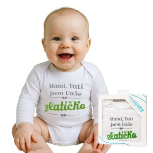 Originálne bavlnené dojčenské body s dlhým rukávom New Baby, s vtipným nápisom Mami, Oci som Vaše zlatíčko. Farby použité na potlač sú certifikované a vhodné pre bábätká. Je vyrobené z príjemného a kvalitného materiálu, v ktorom sa bude Vaše bábätko cítiť príjemne. Body má zapínanie na cvočky na ramienku a medzi nožičkami, čo uľahčuje obliekanie a prebaľovanie. Doprajte Vášmu bábätku vyniknúť v originálnom bode. Zloženie: 100% bavlna. Rozmery: obvod okolo hrudníka cca 34 cm, dĺžka rukáva cca 16 cm, celková dĺžka cca 30 cm.<BR>Produkt českej značky