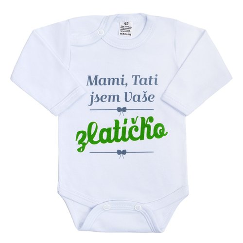 Originálne bavlnené dojčenské body s dlhým rukávom New Baby, s vtipným nápisom Mami, Oci som Vaše zlatíčko. Farby použité na potlač sú certifikované a vhodné pre bábätká. Je vyrobené z príjemného a kvalitného materiálu, v ktorom sa bude Vaše bábätko cítiť príjemne. Body má zapínanie na cvočky na ramienku a medzi nožičkami, čo uľahčuje obliekanie a prebaľovanie. Doprajte Vášmu bábätku vyniknúť v originálnom bode. Zloženie: 100% bavlna. Rozmery: obvod okolo hrudníka cca 46 cm, dĺžka rukáva cca 24 cm, celková dĺžka cca 40 cm.<BR>Produkt českej značky