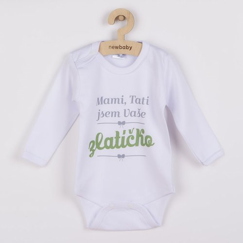 Originálne bavlnené dojčenské body s dlhým rukávom New Baby, s vtipným nápisom Mami, Oci som Vaše zlatíčko. Farby použité na potlač sú certifikované a vhodné pre bábätká. Je vyrobené z príjemného a kvalitného materiálu, v ktorom sa bude Vaše bábätko cítiť príjemne. Body má zapínanie na cvočky na ramienku a medzi nožičkami, čo uľahčuje obliekanie a prebaľovanie. Doprajte Vášmu bábätku vyniknúť v originálnom bode. Zloženie: 100% bavlna. Rozmery: obvod okolo hrudníka cca 50 cm, dĺžka rukáva cca 26 cm, celková dĺžka cca 42 cm.<BR>Produkt českej značky