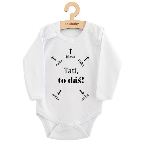 Originálne bavlnené dojčenské body s dlhým rukávom New Baby, s vtipným nápisom Tati, to dáš! Farby použité na potlač sú certifikované a vhodné pre bábätká. Je vyrobené z príjemného a kvalitného materiálu, v ktorom sa bude Vaše bábätko cítiť príjemne. Body má zapínanie na cvočky na ramienku a medzi nožičkami, čo uľahčuje obliekanie a prebaľovanie. Doprajte Vášmu bábätku vyniknúť v originálnom bode. Zloženie: 100% bavlna. Rozmery: obvod okolo hrudníka cca 50 cm, dĺžka rukáva cca 26 cm, celková dĺžka cca 42 cm.<BR>Produkt českej značky
