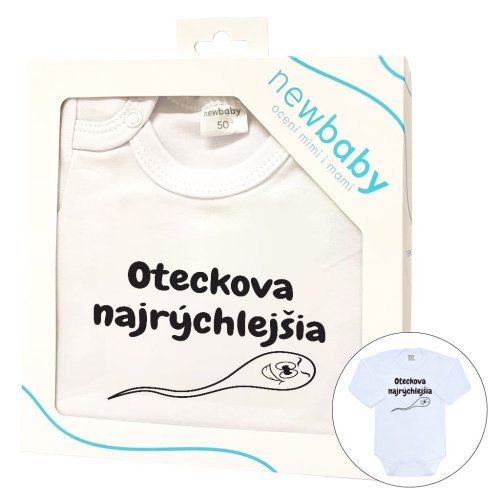 Originálne bavlnené dojčenské body s dlhým rukávom New Baby, s vtipným nápisom OTECKOVA NAJRÝCHLEJŠIA. Farby použité na potlač sú certifikované a vhodné pre bábätká. Je vyrobené z príjemného a kvalitného materiálu, v ktorom sa bude Vaše bábätko cítiť príjemne. Body má zapínanie na cvočky na ramienku a medzi nožičkami, čo uľahčuje obliekanie a prebaľovanie. Doprajte Vášmu bábätku vyniknúť v originálnom bode. Zloženie: 100% bavlna. Rozmery: obvod okolo hrudníka cca 34 cm, dĺžka rukáva cca 16 cm, celková dĺžka cca 30 cm.<BR>- Produkt českej značky