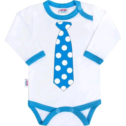Originálne bavlnené dojčenské body s dlhým rukávom New Baby, s obrázkom tyrkysovej kravaty zdobené bodkami. Body má okolo krčku, nožičiek a ručičiek farebné lemovanie. Farby použité na potlač sú certifikované a vhodné pre bábätká. Je vyrobené z príjemného a kvalitného materiálu, v ktorom sa bude Vaše bábätko cítiť príjemne. Body má zapínanie na cvočky na ramienku a medzi nožičkami, čo uľahčuje obliekanie a prebaľovanie. Doprajte Vášmu bábätku vyniknúť v originálnom bode. Zloženie: 100% bavlna. Rozmery: obvod okolo hrudníka cca 46 cm, dĺžka rukáva cca 24 cm, celková dĺžka cca 40 cm.<BR>- Produkt českej značky