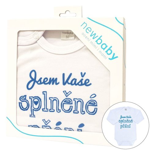 Originálne bavlnené dojčenské body s dlhým rukávom New Baby, s vtipným nápisom Som Vaše splnené prianie. Farby použité na potlač sú certifikované a vhodné pre bábätká. Je vyrobené z príjemného a kvalitného materiálu, v ktorom sa bude Vaše bábätko cítiť príjemne. Body má zapínanie na cvočky na ramienku a medzi nožičkami, čo uľahčuje obliekanie a prebaľovanie. Doprajte Vášmu bábätku vyniknúť v originálnom bode. Zloženie: 100% bavlna. Rozmery: obvod okolo hrudníka cca 34 cm, dĺžka rukáva cca 16 cm, celková dĺžka cca 30 cm.