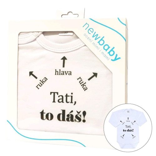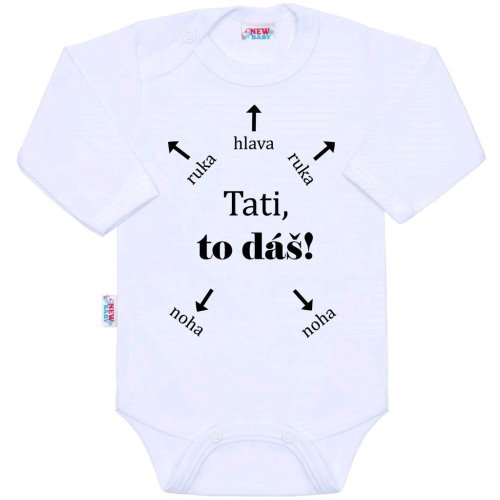 Originálne bavlnené dojčenské body s dlhým rukávom New Baby, s vtipným nápisom Tati, to dáš! Farby použité na potlač sú certifikované a vhodné pre bábätká. Je vyrobené z príjemného a kvalitného materiálu, v ktorom sa bude Vaše bábätko cítiť príjemne. Body má zapínanie na cvočky na ramienku a medzi nožičkami, čo uľahčuje obliekanie a prebaľovanie. Doprajte Vášmu bábätku vyniknúť v originálnom bode. Zloženie: 100% bavlna. Rozmery: obvod okolo hrudníka cca 50 cm, dĺžka rukáva cca 26 cm, celková dĺžka cca 42 cm.