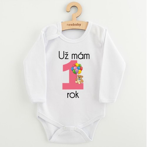 Originálne bavlnené dojčenské body s dlhým rukávom New Baby, s vtipným nápisom Už mám 1 rok a obrázkom veľké jednotky s balónikmi. Farby použité na potlač sú certifikované a vhodné pre bábätká. Je vyrobené z príjemného a kvalitného materiálu, v ktorom sa bude Vaše bábätko cítiť príjemne. Body má zapínanie na cvočky na ramienku a medzi nožičkami, čo uľahčuje obliekanie a prebaľovanie. Doprajte Vášmu bábätku vyniknúť v originálnom bode. Zloženie: 100% bavlna. Rozmery: obvod okolo hrudníka cca 46 cm, dĺžka rukáva cca 24 cm, celková dĺžka cca 40 cm.<BR>Produkt českej značky