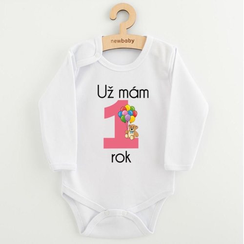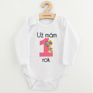 Originálne bavlnené dojčenské body s dlhým rukávom New Baby, s vtipným nápisom Už mám 1 rok a obrázkom veľké jedničky s balónikmi.