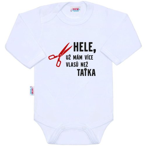Originálne bavlnené dojčenské body s dlhým rukávom New Baby, s vtipným nápisom HELE, UŽ MÁM VIAC VLASOV AKO Otecka. Farby použité na potlač sú certifikované a vhodné pre bábätká. Je vyrobené z príjemného a kvalitného materiálu, v ktorom sa bude Vaše bábätko cítiť príjemne. Body má zapínanie na cvočky na ramienku a medzi nožičkami, čo uľahčuje obliekanie a prebaľovanie. Doprajte Vášmu bábätku vyniknúť v originálnom bode. Zloženie: 100% bavlna. Rozmery: obvod okolo hrudníka cca 34 cm, dĺžka rukáva cca 16 cm, celková dĺžka cca 30 cm.<BR>- Produkt českej značky