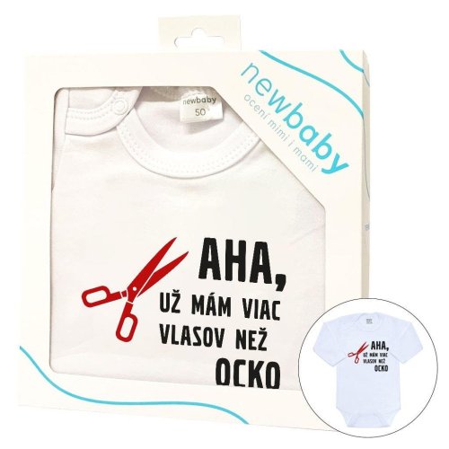 Originálne bavlnené dojčenské body s dlhým rukávom New Baby, s vtipným nápisom AHA UŽ MÁM VIAC VLASOV AKO OCKO. Farby použité na potlač sú certifikované a vhodné pre bábätká. Je vyrobené z príjemného a kvalitného materiálu, v ktorom sa bude Vaše bábätko cítiť príjemne. Body má zapínanie na cvočky na ramienku a medzi nožičkami, čo uľahčuje obliekanie a prebaľovanie. Doprajte Vášmu bábätku vyniknúť v originálnom bode. Zloženie: 100% bavlna. Rozmery: obvod okolo hrudníka cca 50 cm, dĺžka rukáva cca 26 cm, celková dĺžka cca 42 cm.<BR>Produkt českej značky
