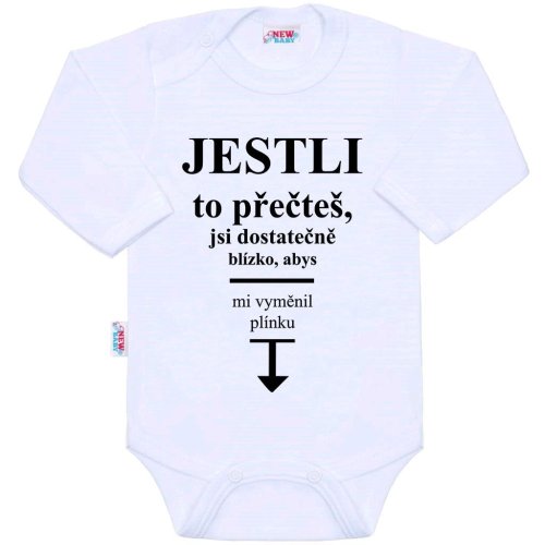Originálne bavlnené dojčenské body s dlhým rukávom New Baby, s vtipným nápisom Jesť to prečítaš, si dostatočne blízko, aby si mi vymenil plienku. Farby použité na potlač sú certifikované a vhodné pre bábätká. Je vyrobené z príjemného a kvalitného materiálu, v ktorom sa bude Vaše bábätko cítiť príjemne. Body má zapínanie na cvočky na ramienku a medzi nožičkami, čo uľahčuje obliekanie a prebaľovanie. Doprajte Vášmu bábätku vyniknúť v originálnom bode. Zloženie: 100% bavlna. Rozmery: obvod okolo hrudníka cca 50 cm, dĺžka rukáva cca 26 cm, celková dĺžka cca 42 cm.<BR>Produkt českej značky