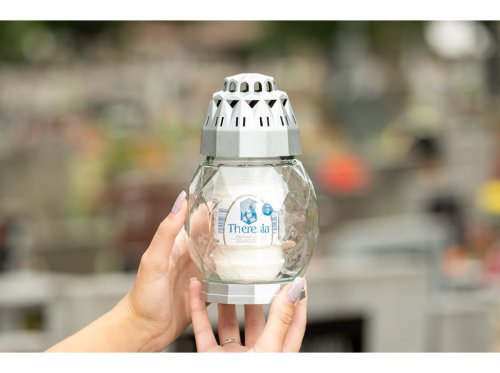 Táto sviečka s diamantovým vzorom poskytuje 24 hodín horenia a je ideálna pre cintorínsku dekoráciu a spomienky na blízkych. Jej rozmery sú 18 cm.