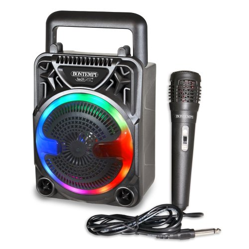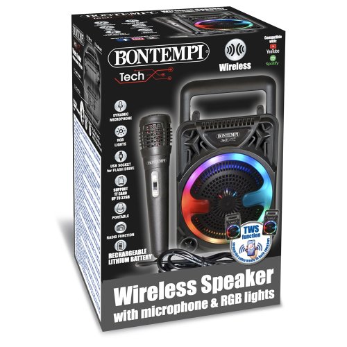 Bezdrôtový reproduktor s mikrofónom a RGB osvetlením. Funkcia TWS – umožňuje pripojiť dva reproduktory rovnakého modelu k jednému smartfónu alebo inému bezdrôtovému zdroju a užívať si stereo kvalitu zvuku. Počúvanie hudby/audio – z USB disku (nie je súčasťou balenia), z micro SD karty (nie je súčasťou balenia, až 32 GB), cez bezdrôtové pripojenie. Funkcia rádia. Kompatibilné so Spotify a YouTube.Tlačítko na aktiváciu svetelných efektov. USB Type-C konektor na nabíjanie lítiové batérie (nabíjací kábel je súčasťou balenia). Rozmery: 115 × 190 × 90 mm